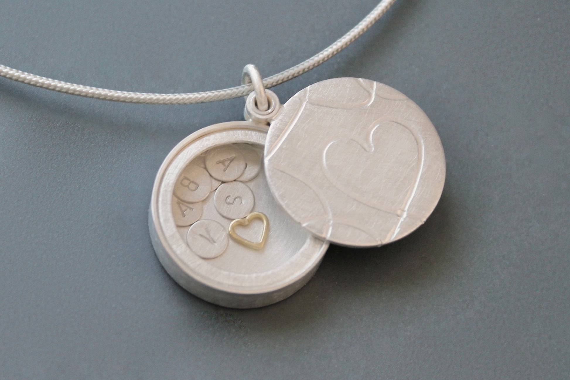 Ein elegantes Herzmotiv ziert den Deckel dieses Medaillons aus Sterling Silber. Schiebt man den Deckel des Medaillons zur Seite, kommen kleine silberne Plättchen mit Buchstaben und ein goldenes Herz zum Vorschein. Die Plättchen können mit einem Wunschnamen oder einer kurzen Botschaft bestempelt werden. Die Plättchen bewegen sich frei im Innern des Medaillons.