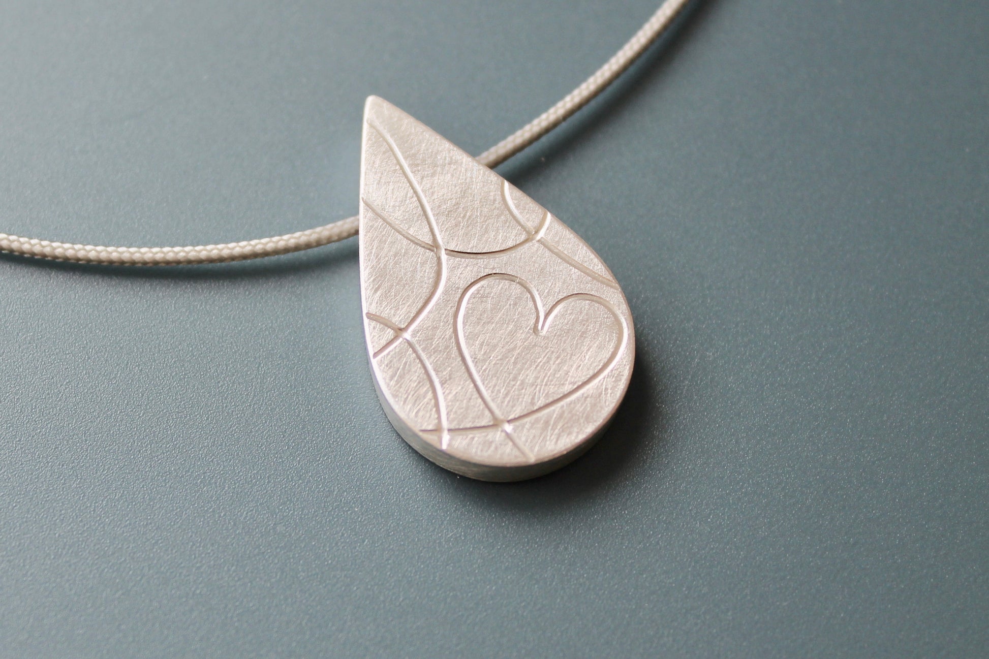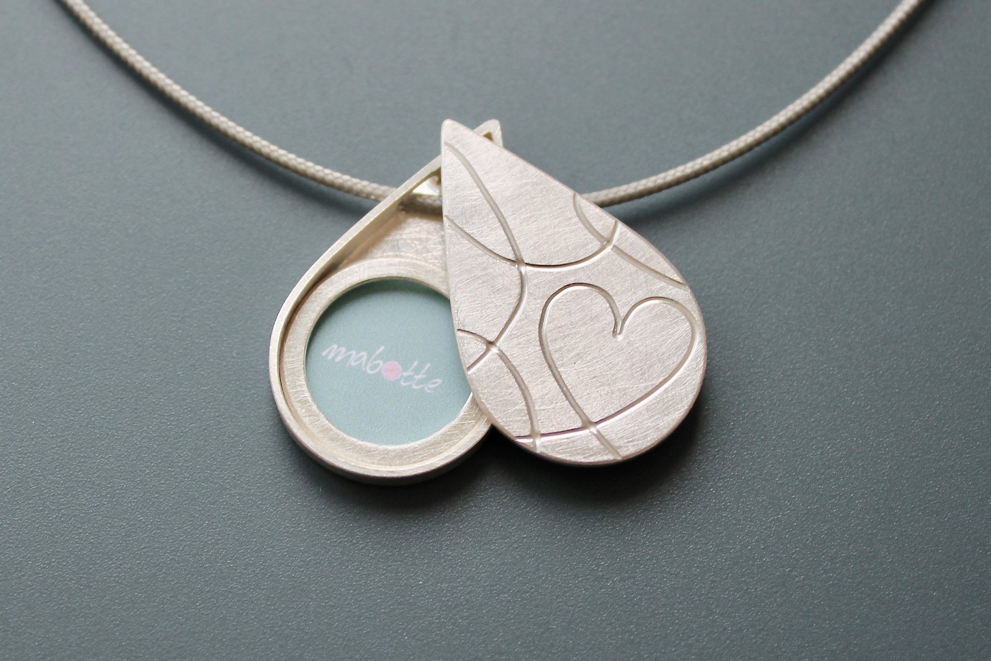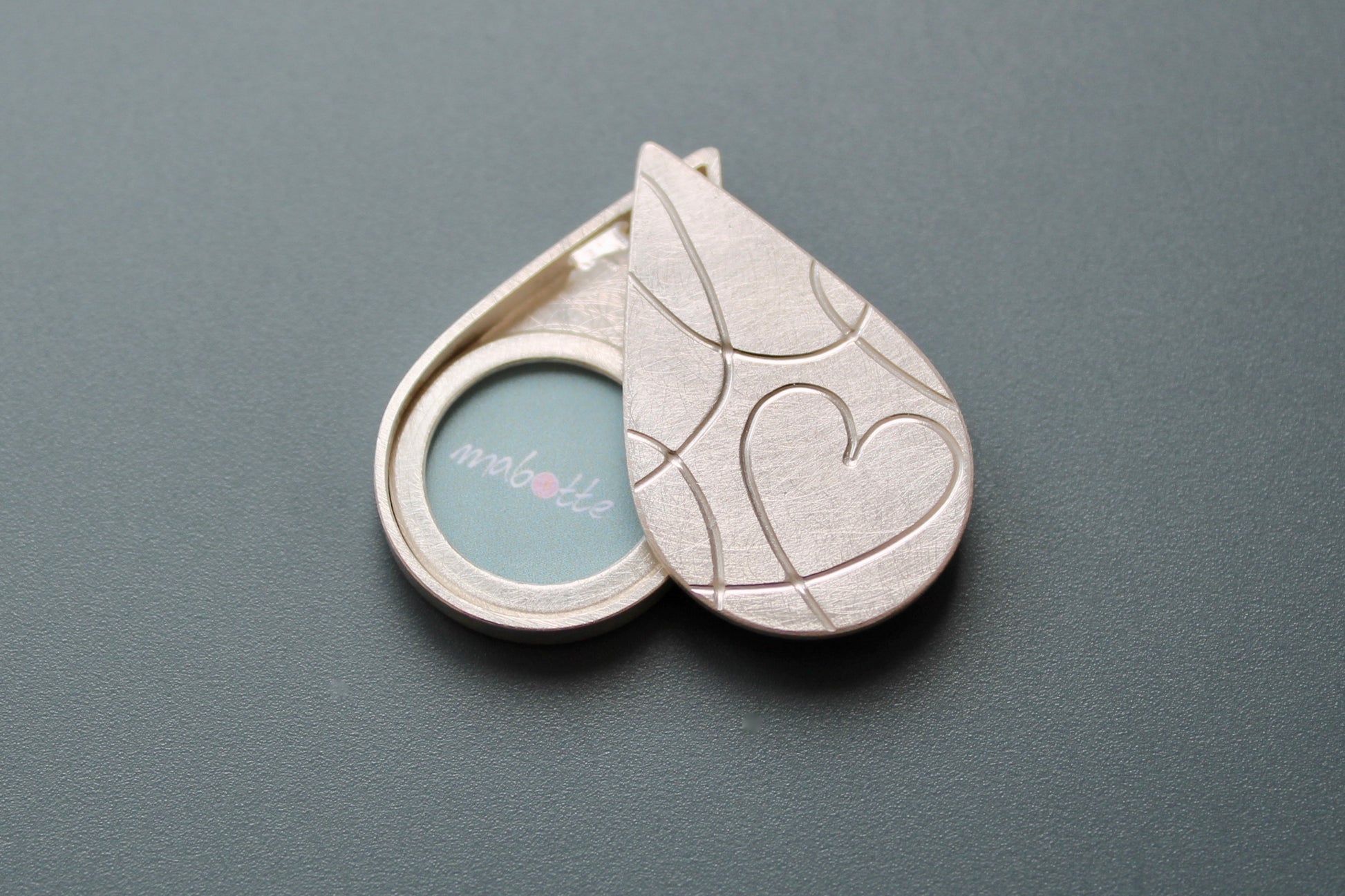 einzigartiges Silbermedaillon für ein Foto in Tropfenform mit modernem Herzmotiv