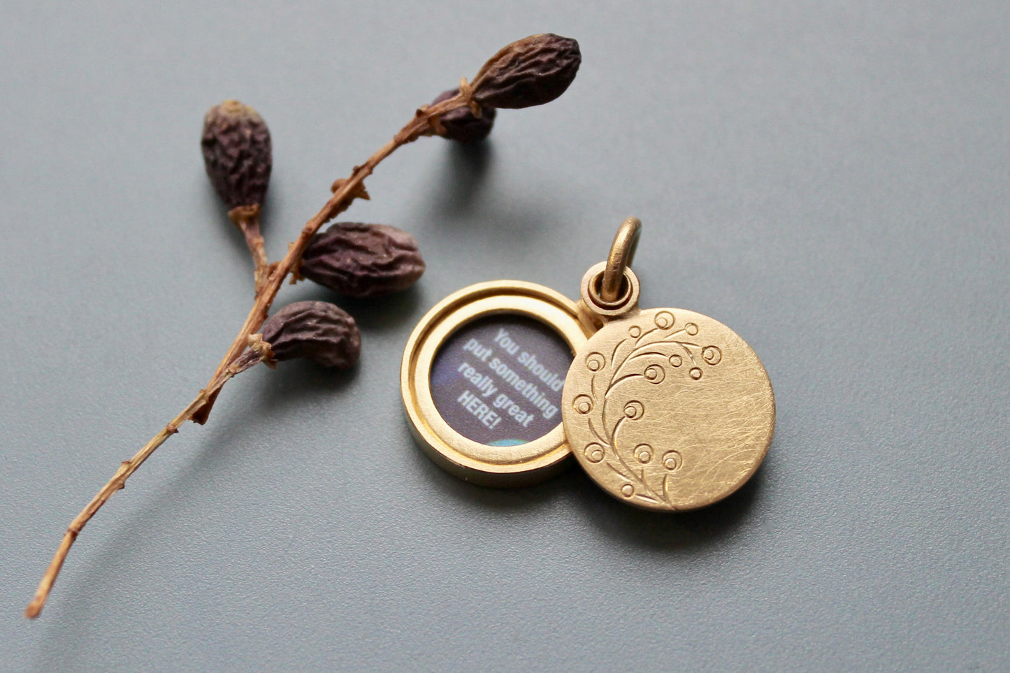 A romantic, small locket handmade in 18ct yellow gold with a delicate twig along the rim.
