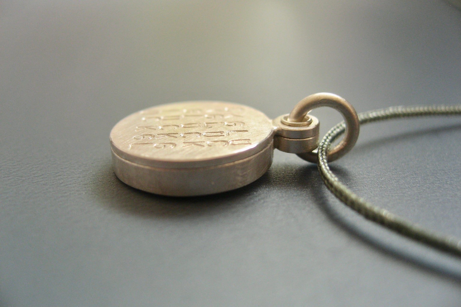 The lid of the locket is stamped with the german word GLÜCK in a typographic pattern. It means Happiness or Bliss.